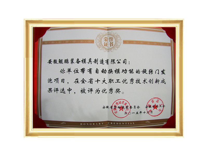 十大職工優(yōu)秀技術獎自動換模旋轉門發(fā)優(yōu)秀獎證書