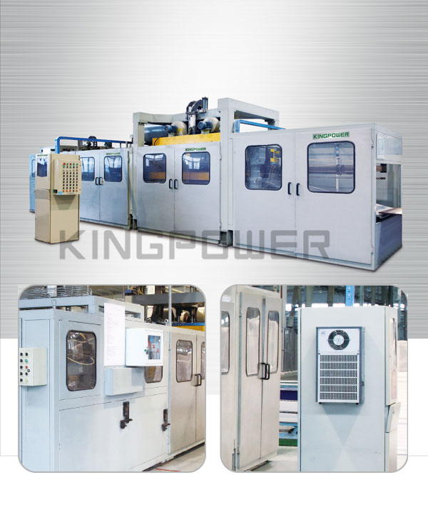 三工位門襯真空成型機(jī)主要用于生產(chǎn)冰箱門襯,由上料、加熱、成型等部分組成。