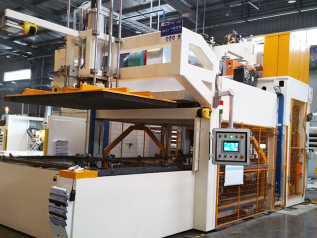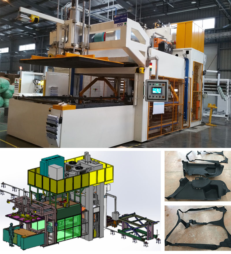 適用于汽車(chē)地毯、前圍、輪罩、隔音墊等產(chǎn)品的熱壓成型。主要由上料部分、加熱烘箱、壓機(jī)、釘框循環(huán)部分、氣動(dòng)液壓系統(tǒng)及電控系統(tǒng)組成。廣泛用于軍事車(chē)輛內(nèi)部軟飾品及隔音件零部件制造。