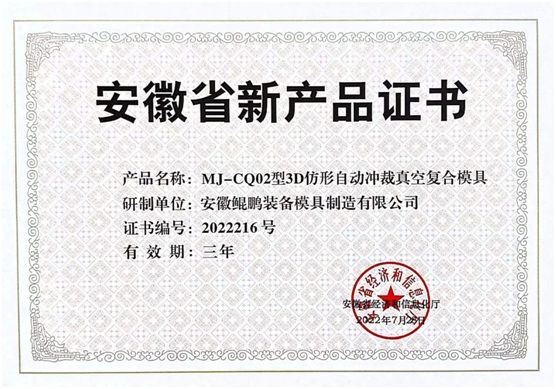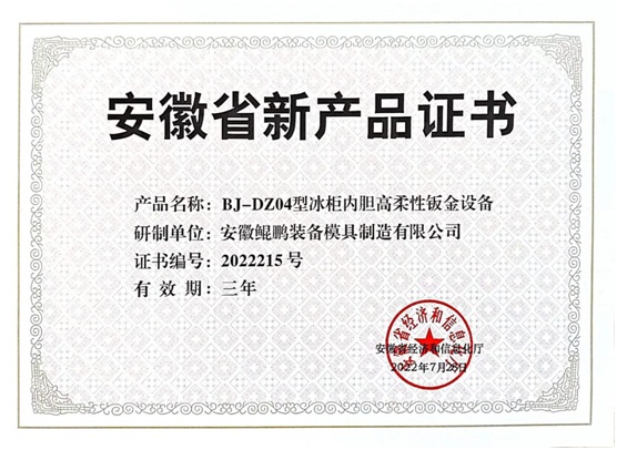 繼4月份的兩件省級新產品后,我公司的“3D仿形自動沖裁真空復合模具”、“冰柜內膽高柔性鈑金設備”于7月28日獲得了安徽省經濟和信息化廳頒發(fā)的安徽省新產品證書。公司目前累計獲得各級新產品認定共22項