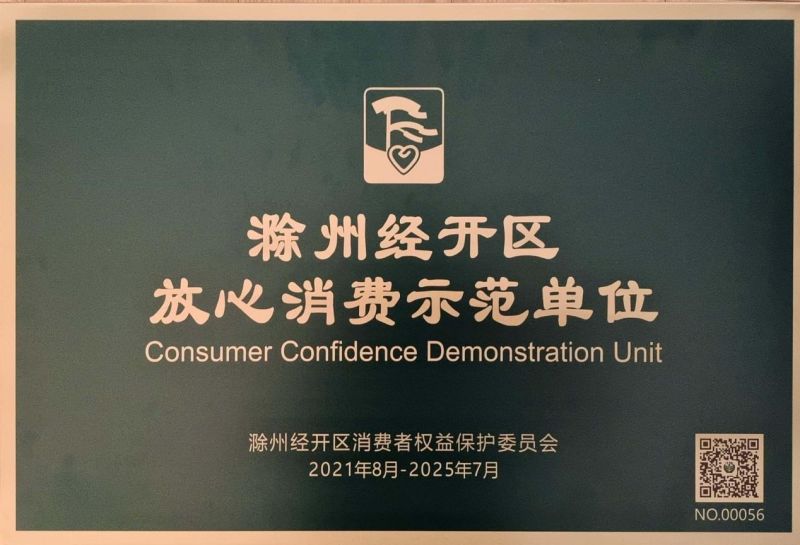 2021年9月29日公司被滁州經(jīng)開區(qū)消費(fèi)者權(quán)益保護(hù)委員會(huì)授予“滁州經(jīng)開區(qū)放心消費(fèi)示范企業(yè)”榮譽(yù)稱號。