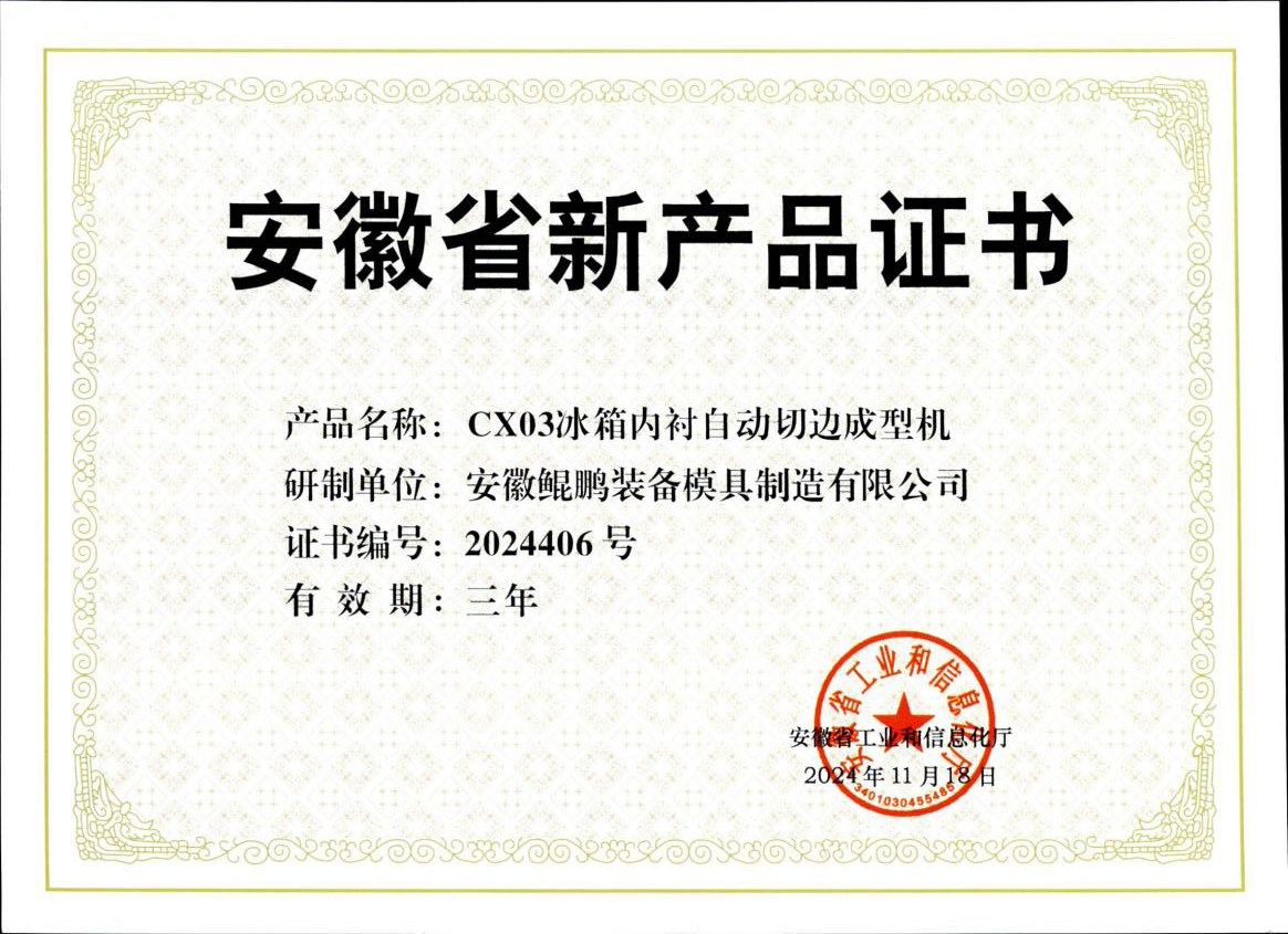 2024年9月,我司“冰箱內(nèi)襯自動切邊成型機關鍵技術研發(fā)及產(chǎn)業(yè)化”、“防盜門板成型設備關鍵技術研發(fā)及產(chǎn)業(yè)化”兩項科技成果通過安徽省科技廳認定,獲得省級科技成果認定證書。此外,“雙模旋轉(zhuǎn)汽車內(nèi)飾成型機關鍵技...