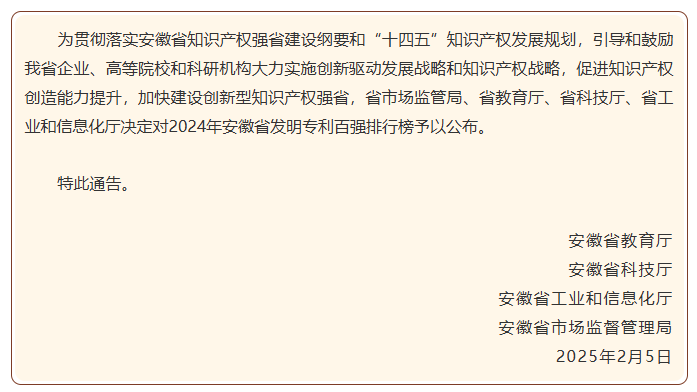 2025年2月5日,安徽省市場監(jiān)督管理局,安徽省教育廳,安徽省科學技術廳,安徽省工業(yè)和信息化廳聯(lián)合發(fā)布了“安徽省發(fā)明專利百強排行榜”,我司在全省高校、科研院所、企業(yè)中脫穎而出,連續(xù)9年榮登發(fā)明專利百強榜。...